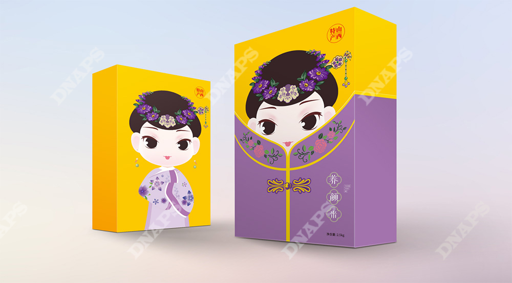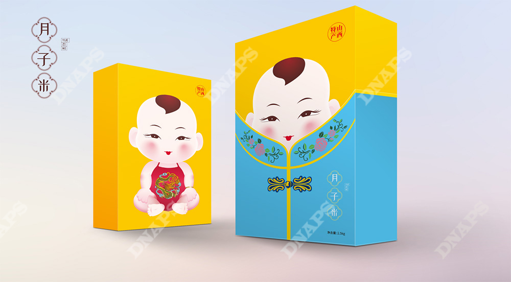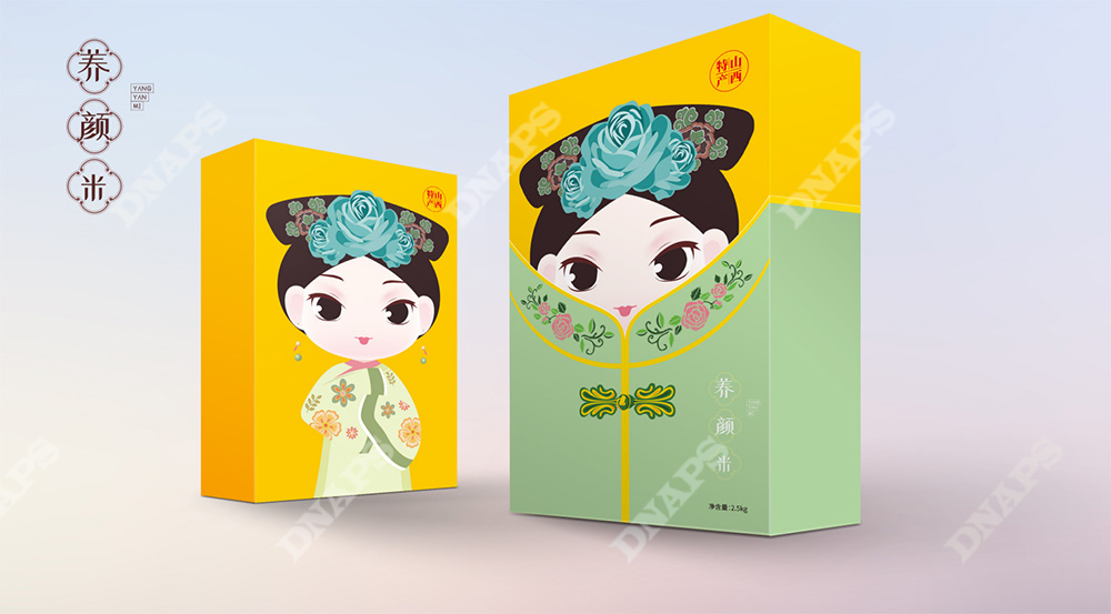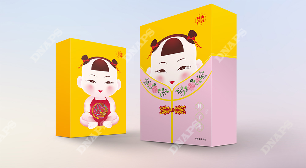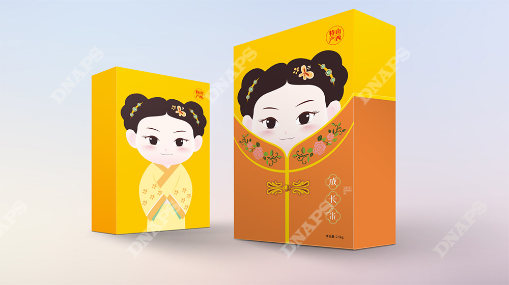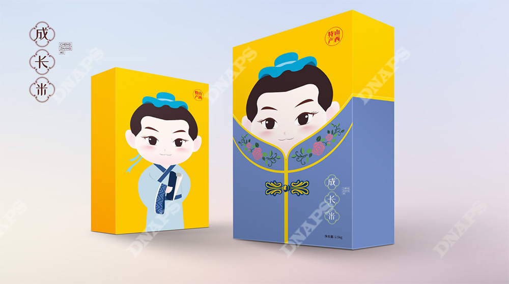 區(qū)別于傳統(tǒng)小米包裝,根據(jù)小米的不同搭配將小米分為月子米,成長米,養(yǎng)顏米3類,視覺上分別以成對的嬰兒、小孩、年輕女性/媽媽為主要形象元素,采用現(xiàn)代插畫的形式創(chuàng)造三組萌趣生動的形象,畫面生動富有張力,配色清醒典雅,增強(qiáng)產(chǎn)品親和力。包裝盒外加設(shè)計(jì)有古典服飾圖形的封套,整體形式新穎富有層次感,拆掉封套將呈現(xiàn)另一幅畫面,開盒有趣味,讓整體形成記憶點(diǎn)。