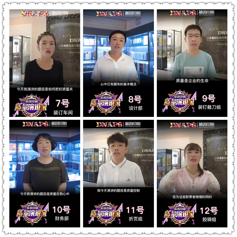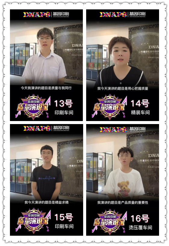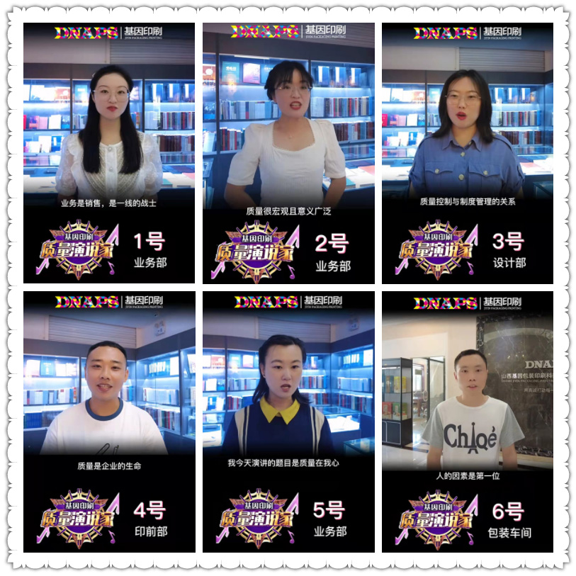 為了讓“質(zhì)量”意識(shí)深入人心,基因印刷組織了一場(chǎng)別開生面的“質(zhì)量演說(shuō)家”演講比賽。負(fù)責(zé)人積極商討比賽形式,最后決定通過(guò)視頻錄制的形式公開發(fā)布在線上請(qǐng)客戶和全體員工投票。票選出的優(yōu)秀代表在本周六的質(zhì)量大會(huì)上進(jìn)行現(xiàn)場(chǎng)的演講。新穎的比賽形式激發(fā)了全體員工的熱情,各部門員工踴躍參與,利用早會(huì)和空余時(shí)間進(jìn)行練習(xí)和彩排,最后共有16人脫穎而出。不同部門的員工從不同的角度詮釋了自己對(duì)“質(zhì)量”的理解,一遍遍的練習(xí),一遍遍的重復(fù),不僅演講人自己,聽的人也在不知不覺(jué)中對(duì)“質(zhì)量”有了自己的思考。